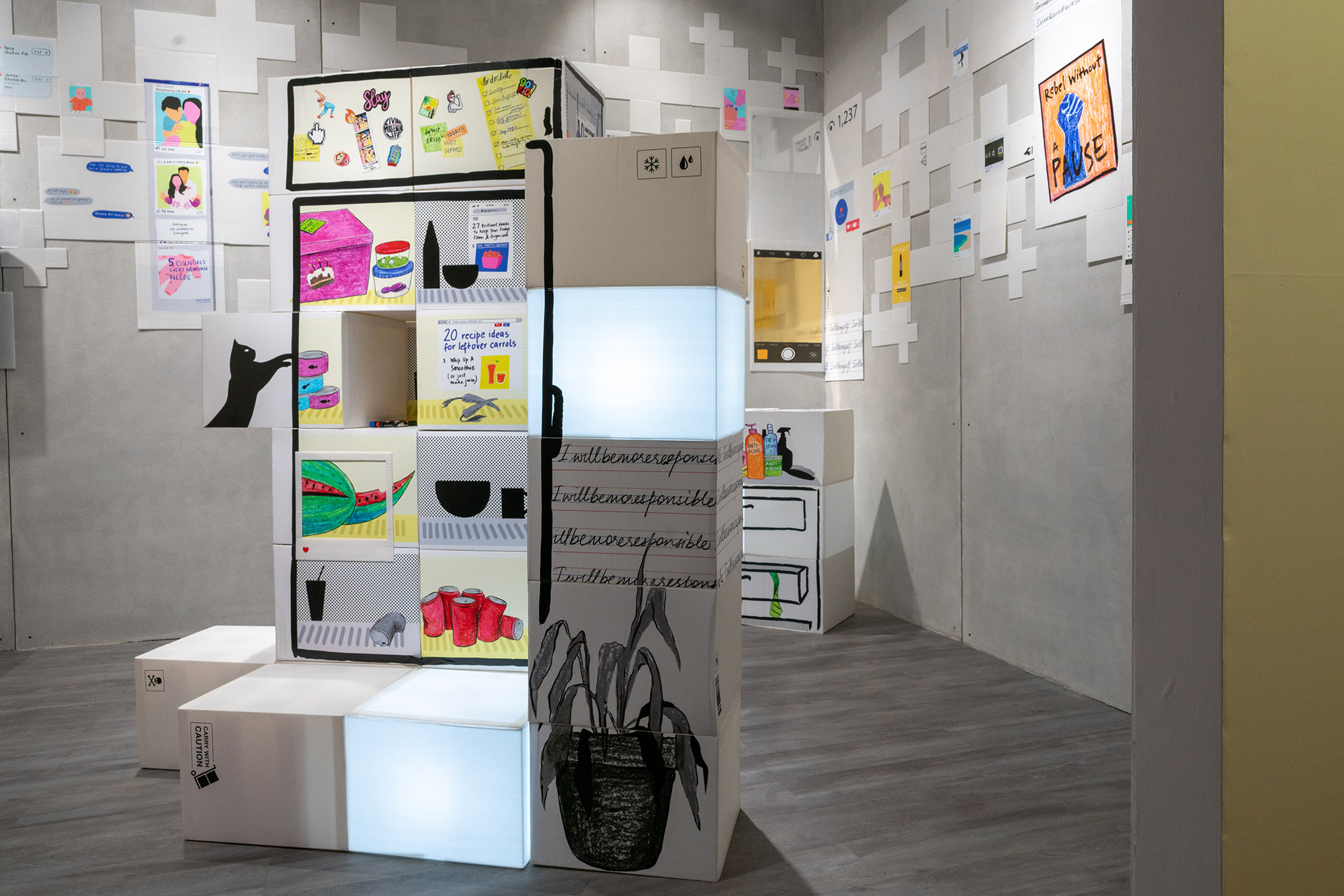 Adulting is an outlet of the collective disdain for the conventional ‘college-job-marriage-house-car’ route to accomplishment among millennials and Gen Z. It celebrates non-conforming as a badge of success, thinly-veiled with self deprecating humour on the inability to ‘adult’ . The idea of Adulting is presented through an abstracted space created using stacked cartons and bold yet child-like imagery and illustrations. The idea is to have the viewer explore this personality and its nuances through various niches and objects presented through humorous visuals and text highlighting the everyday struggles of this millennial 'adult'.